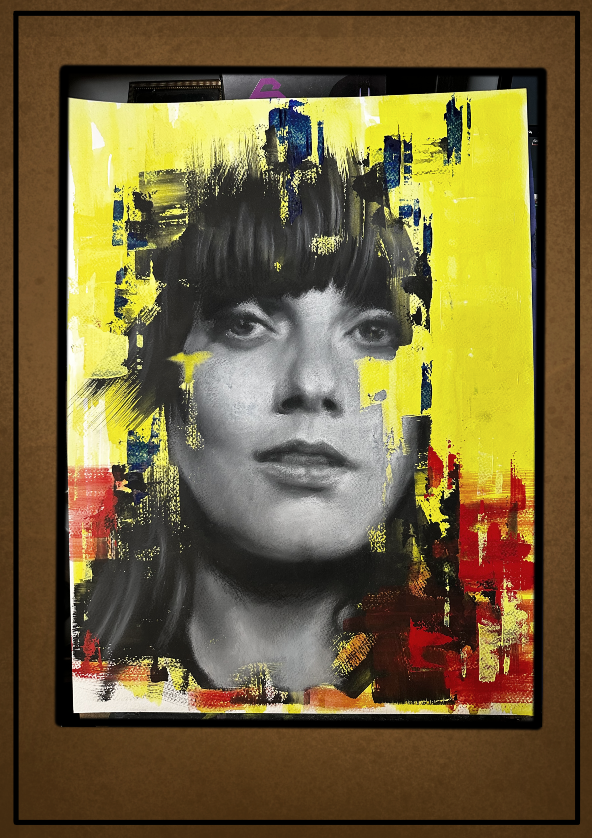 She is the lead singer of band The last internationale. I wanted the image to appear something that resembles a poster that is a bit torn on a wall, with a color scheme that creates appearance of protest. That was the main goal, so alot of the foundation was created by painting knife and brush to have the edges appear randomly broken.