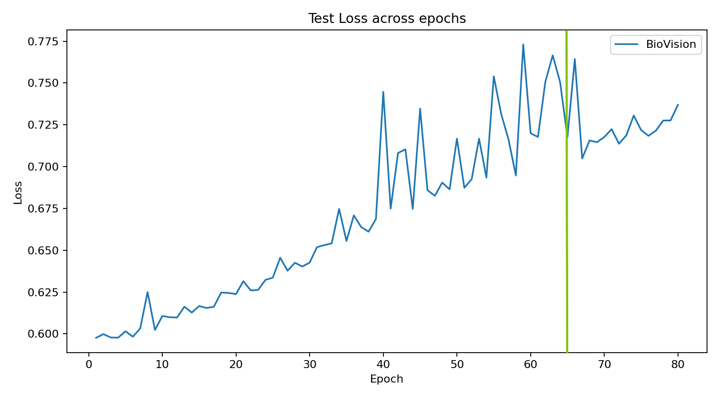 Test loss shows clear markers for overfitting behaviour prior to epoch 65, that begins to stabilize after Verification kicks in.