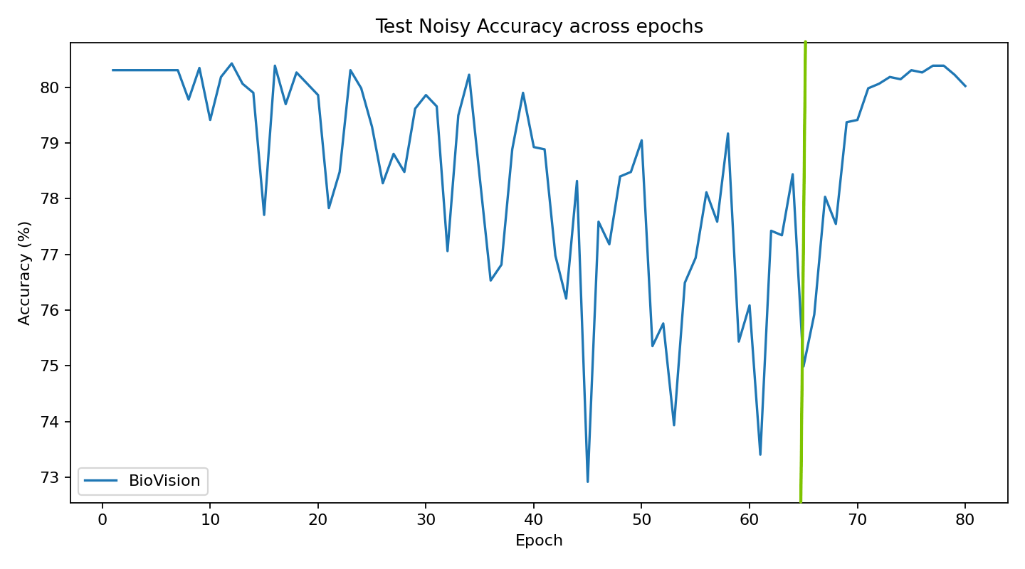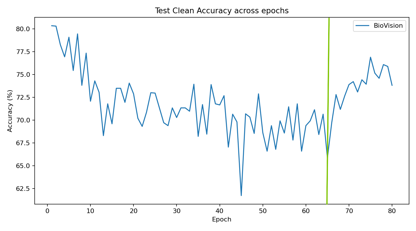 Prior to epoch 65 the test accuracy on clean oscillates and plummets, until post epoch 65 resurrection happens.