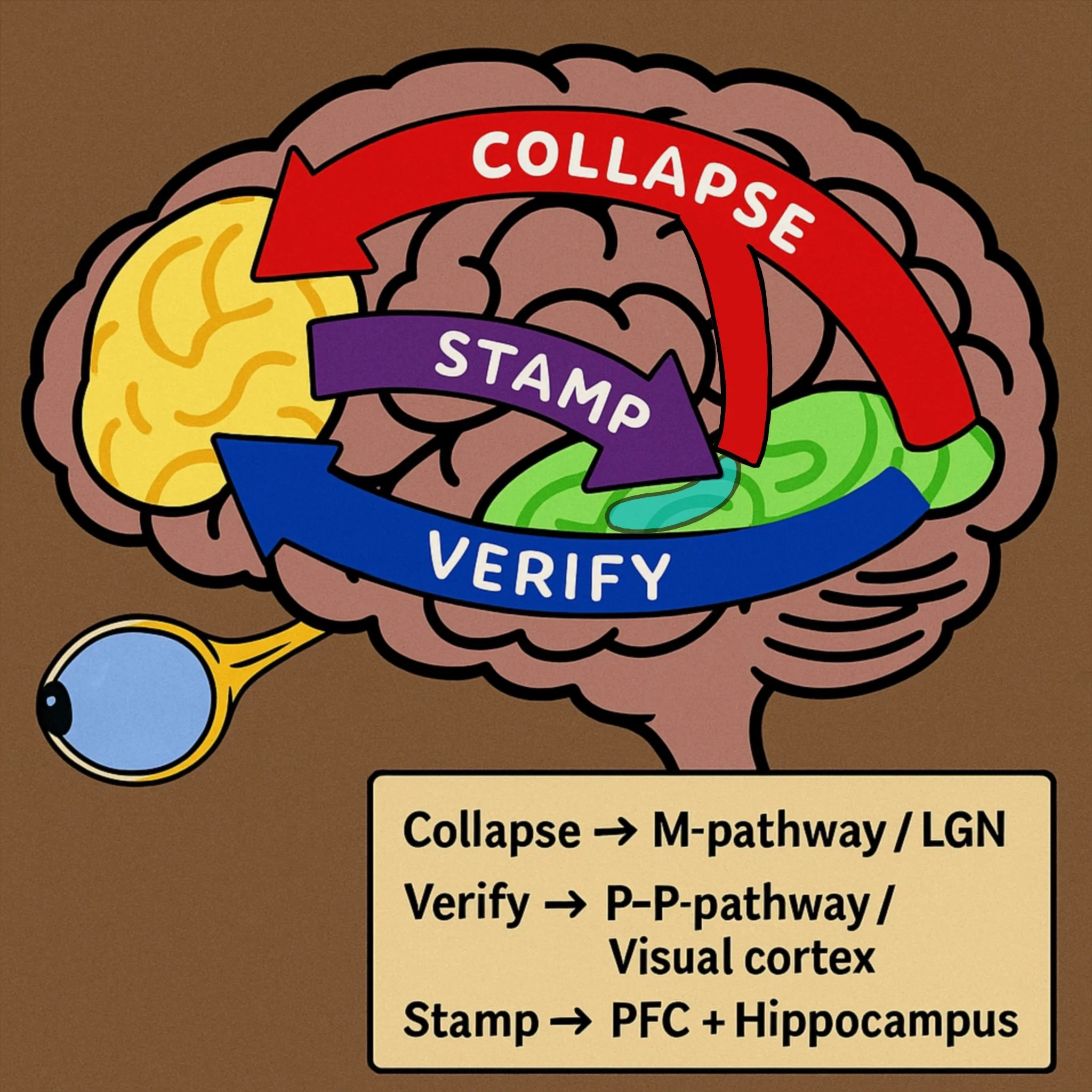 > Collapse-Verify-Stamp process: perception as timing and negotiation.